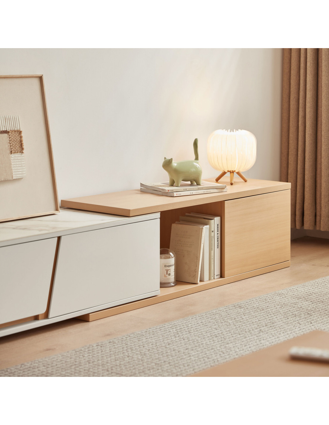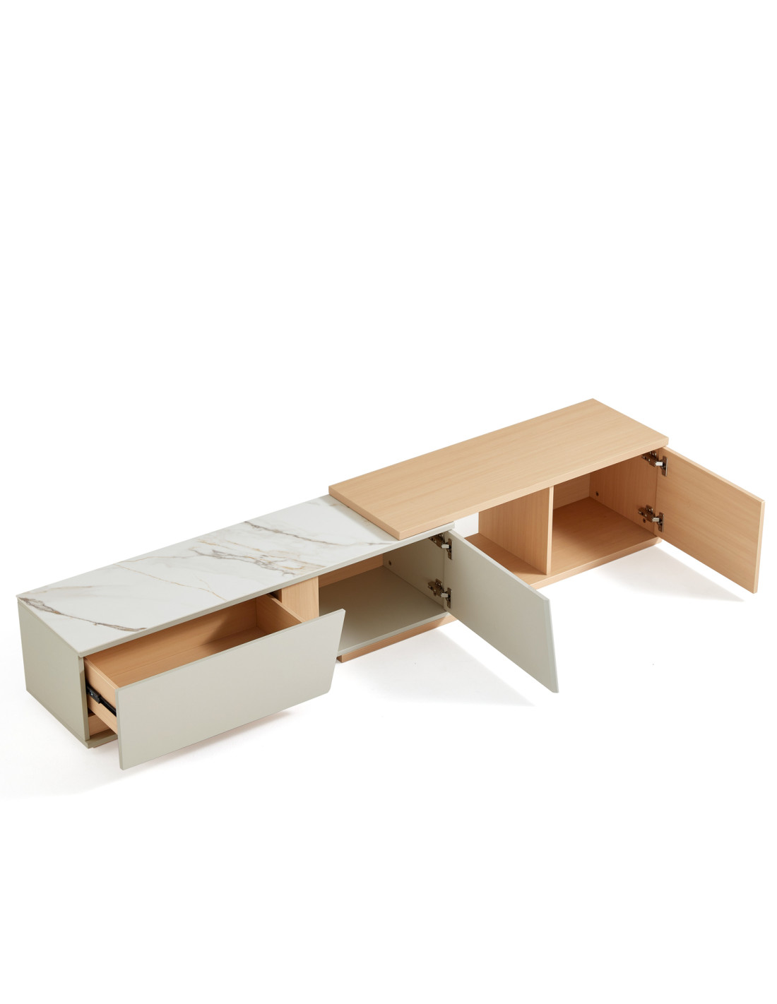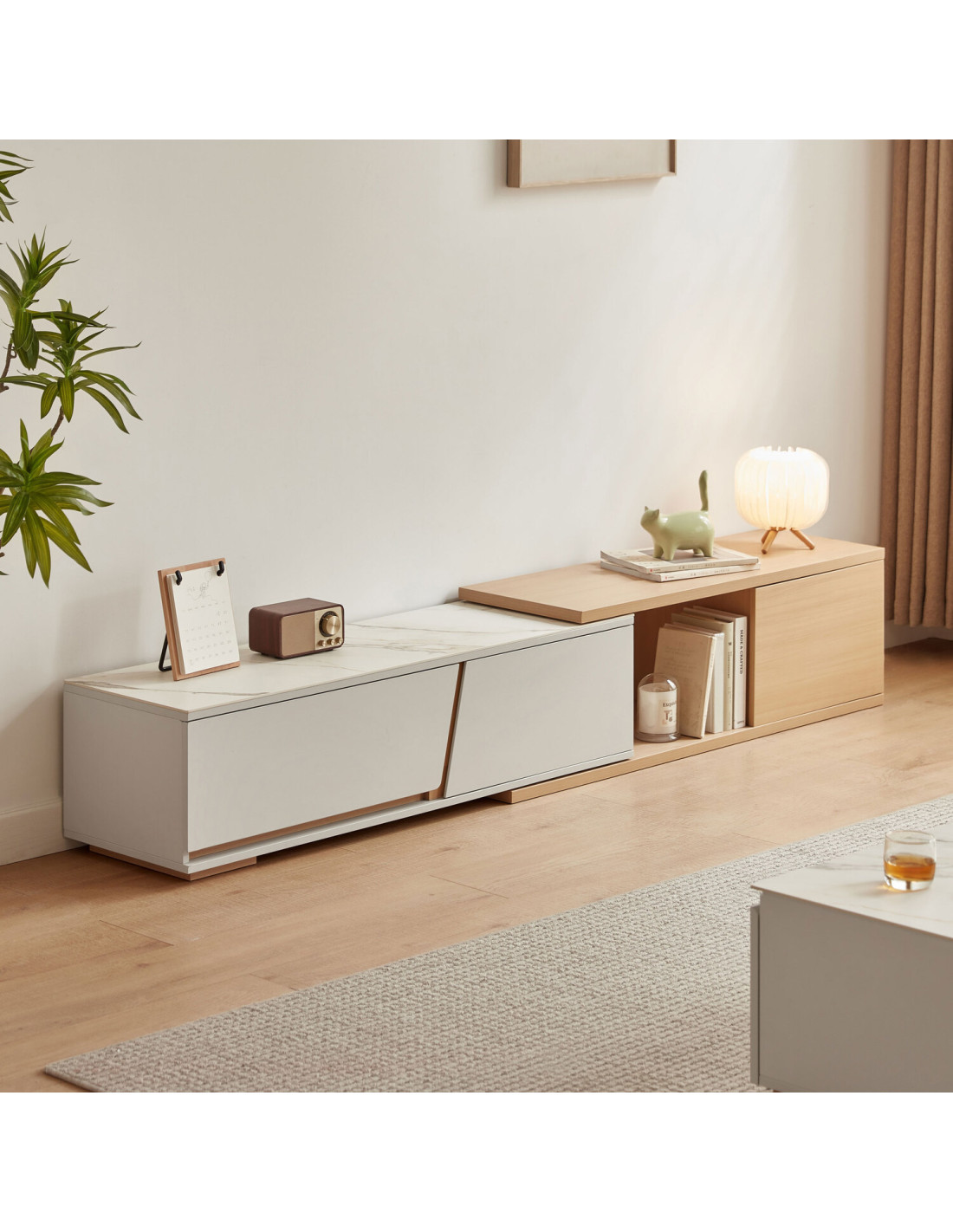 Descubre el elegante Rack TV Marcel, diseñado para adaptarse a tus necesidades con estilo y funcionalidad. Su innovador tablero extensible se despliega sin esfuerzo, ofreciendo una superficie adicional perfecta para acomodar un televisor más grande, exhibir tus objetos decorativos favoritos o crear un práctico espacio de trabajo temporal. Este versátil mueble destaca por su mecanismo de extensión sin juntas, que garantiza un funcionamiento suave y sin complicaciones, brindando una experiencia de uso cómoda y sin interrupciones.