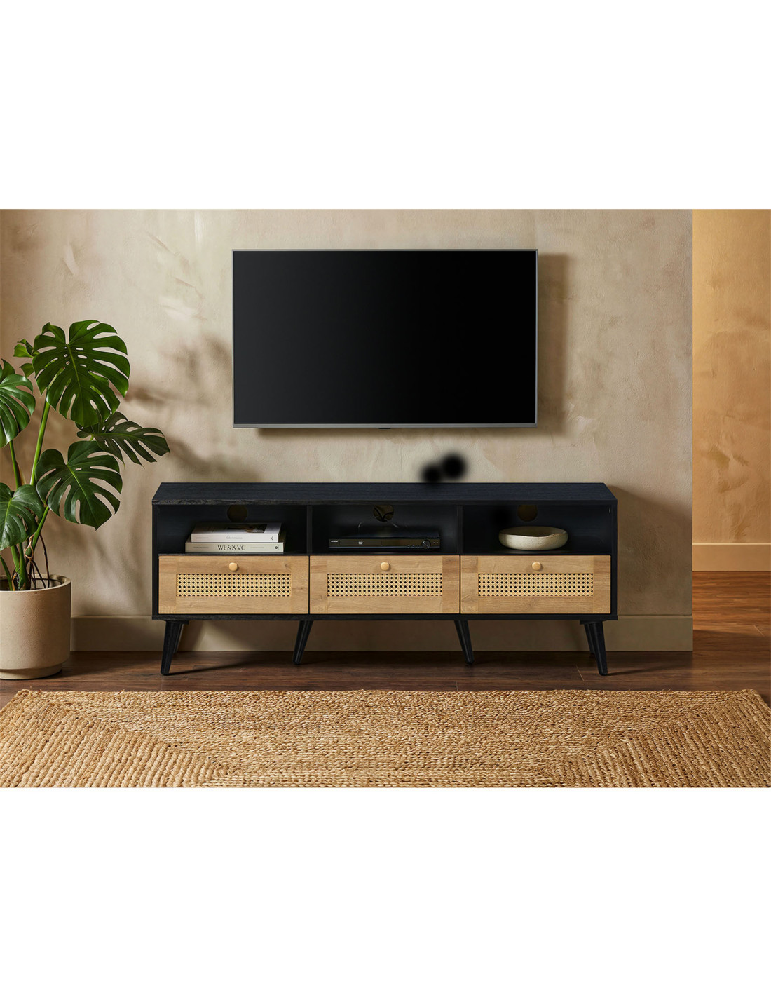 Rack TV 3 cajones en MDP melamina, perfecto para organizar dispositivos y mantener el living ordenado.