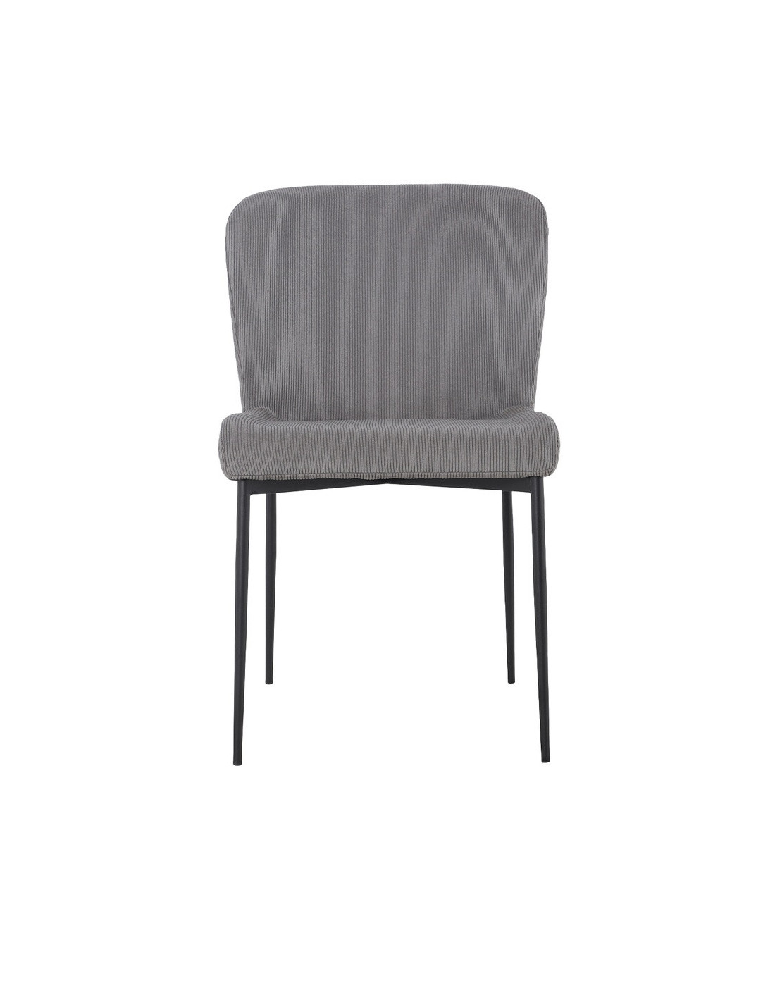 Silla de comedor con estructura y patas de metal. Incorpora espuma de densidad media en asiento y respaldo, ofreciendo comodidad y soporte para el uso diario.