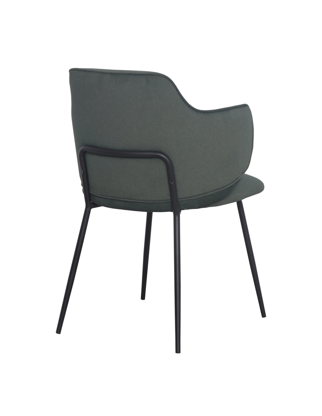 Silla de comedor tapizada en tela, con estructura y patas de metal. Incorpora espuma de alta densidad en asiento y respaldo, ofreciendo comodidad y soporte para el uso diario.