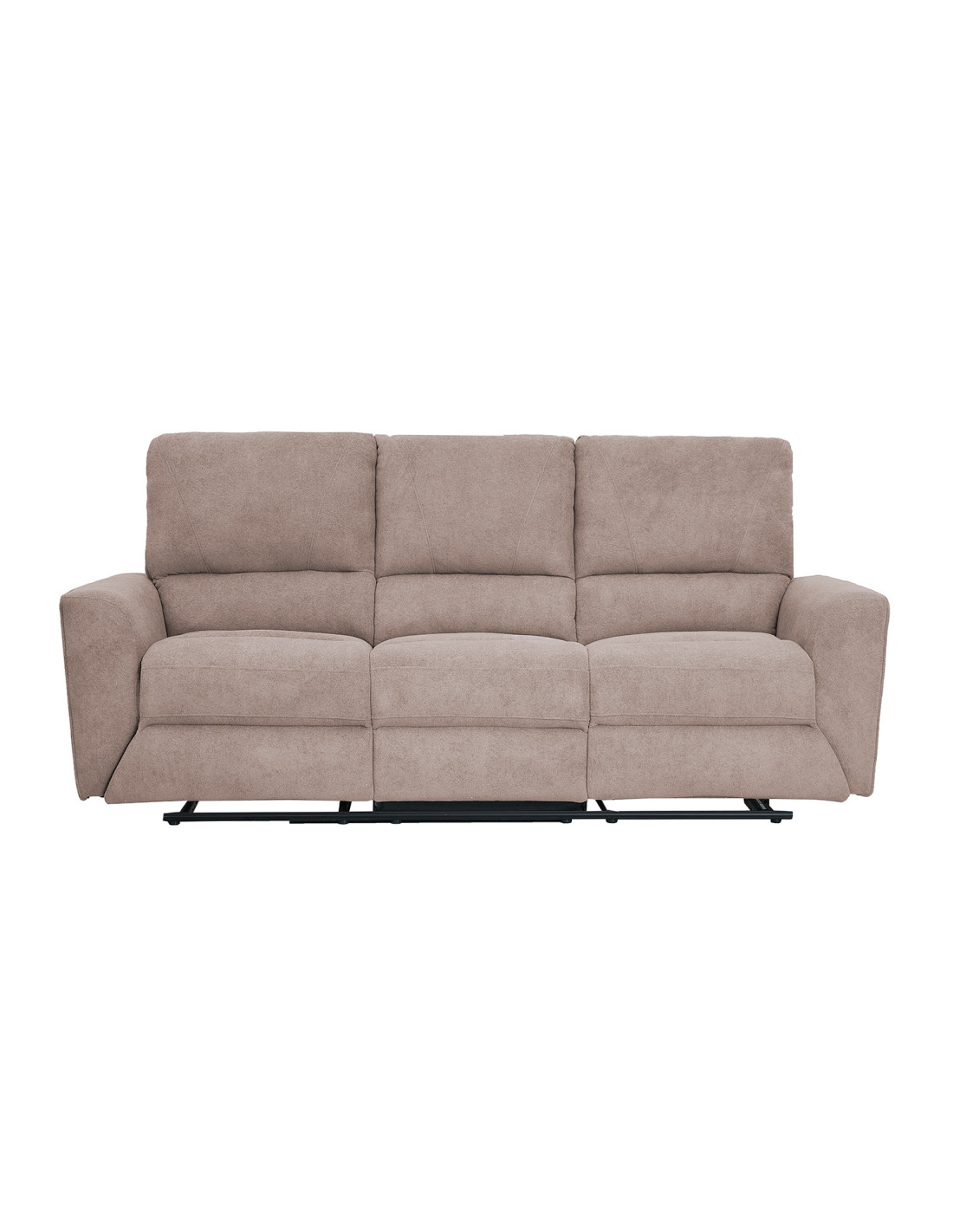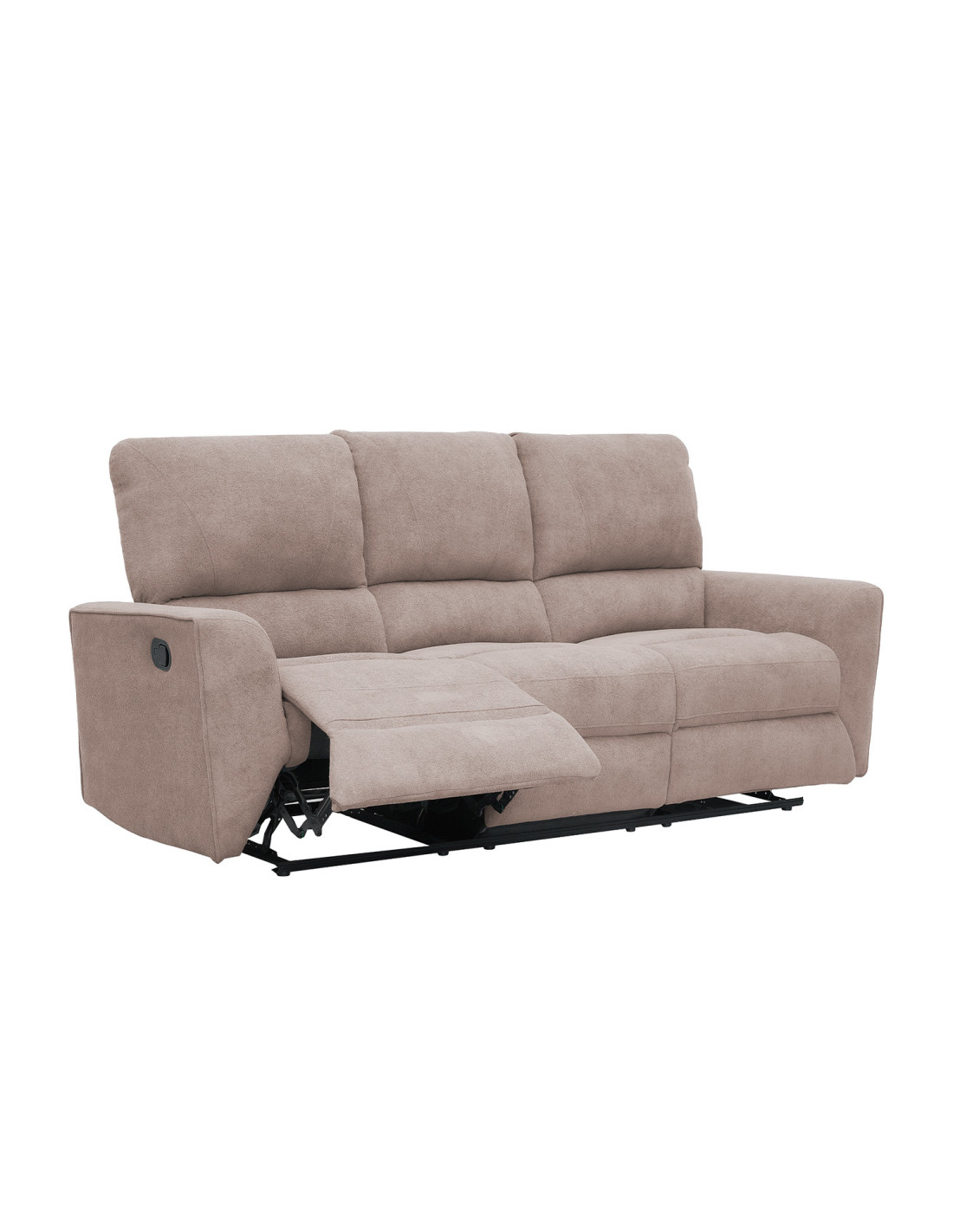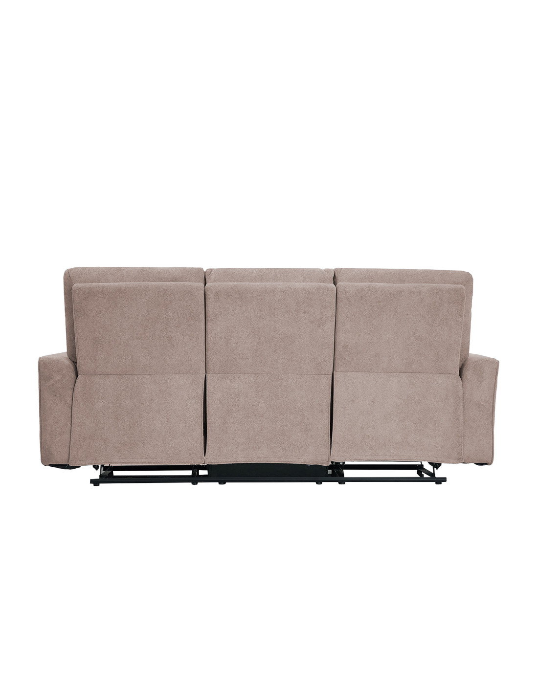 Sofá reclinable 3 cuerpos tapizado en tela suave, con estructura de hierro y contrachapado. Incorpora resortes pocket + zig-zag y relleno de espuma 28D para mayor confort y soporte.