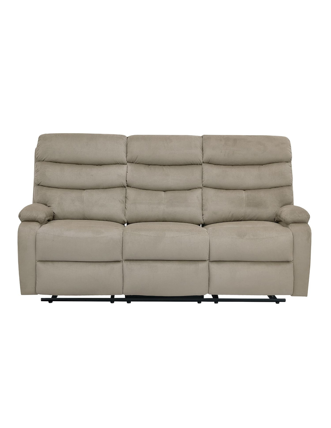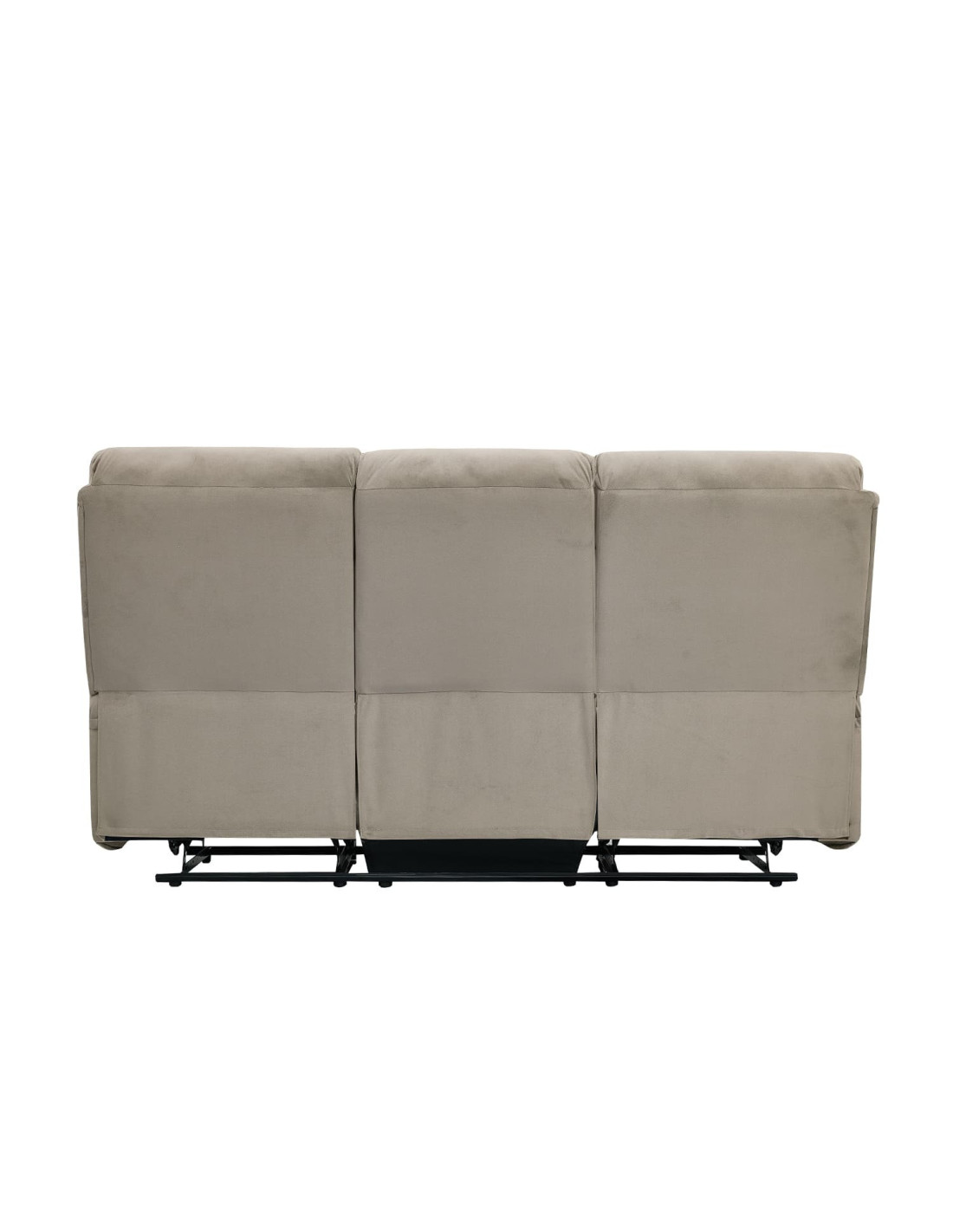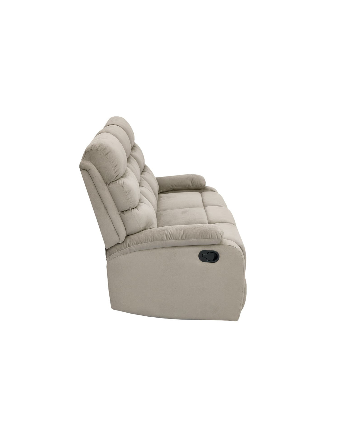 Sofá reclinable 3 cuerpos tapizado en tela suave, con estructura de hierro y tablero laminado. Incorpora resortes pocket + zig-zag y relleno de espuma 28D para mayor confort y soporte.