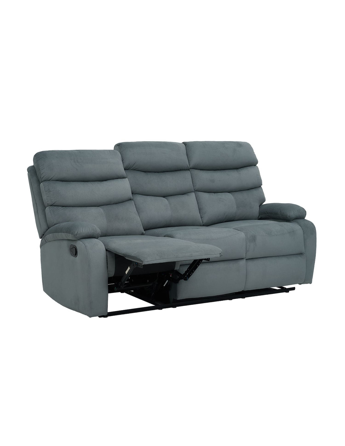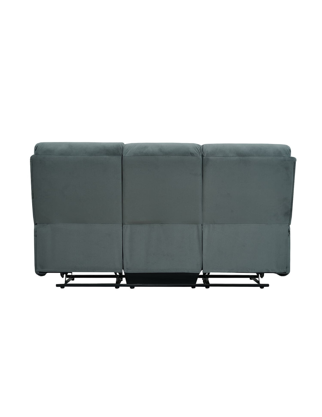 Sofá reclinable 3 cuerpos tapizado en tela suave, con estructura de hierro y tablero laminado. Incorpora resortes pocket + zig-zag y relleno de espuma 28D para mayor confort y soporte.