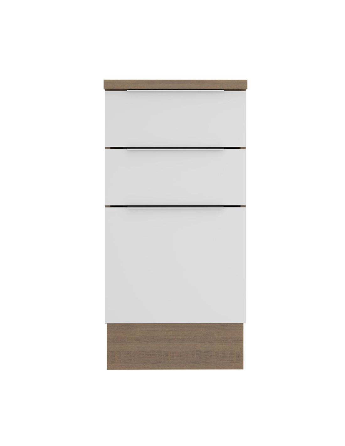 La base de cocina Stella blanca con 3 cajones de 40 cm es la solución perfecta para organizar tu espacio de manera práctica y estilizada. Su diseño incluye tres cajones, siendo el último más profundo, ideal para almacenar platos y utensilios. Fabricado con materiales de alta calidad, cuenta con un fino mango de aluminio y correderas telescópicas que permiten abrir completamente los cajones. El acabado en patrón de madera rústica, combinado con el interior y frente blanco, aporta luminocidad y frescura, mientras que el mostrador con cubierta pintada de estilo rústico agrega un toque único. Las patas regulables en PVC y el zócalo desmontable facilitan la limpieza, mientras que su pintura Poliéster ecológica asegura durabilidad. Además, al ser modular, puedes combinarlo con otros módulos de la línea Stella, adaptando tu cocina a tus necesidades y estilo.