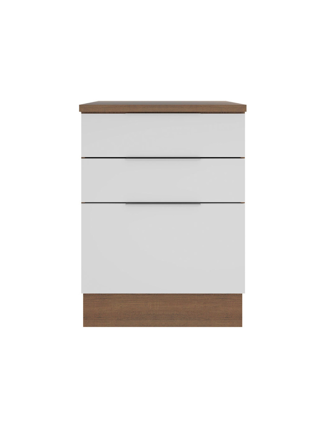 La Base cocina Stella blanca de 3 cajones y 60cm es la solución perfecta para organizar tu espacio de manera práctica y estilizada. Su diseño incluye tres cajones, siendo el último más profundo, ideal para almacenar platos y utensilios. Fabricado con materiales de alta calidad, cuenta con un fino mango de aluminio y correderas telescópicas que permiten abrir completamente los cajones. El acabado en patrón de madera rústica, combinado con el interior y frente blanco, aporta luminocidad y frescura, mientras que el mostrador con cubierta pintada de estilo rústico agrega un toque único. Las patas regulables en PVC y el zócalo desmontable facilitan la limpieza, mientras que su pintura Poliéster ecológica asegura durabilidad. Además, al ser modular, puedes combinarlo con otros módulos de la línea Stella, adaptando tu cocina a tus necesidades y estilo.
