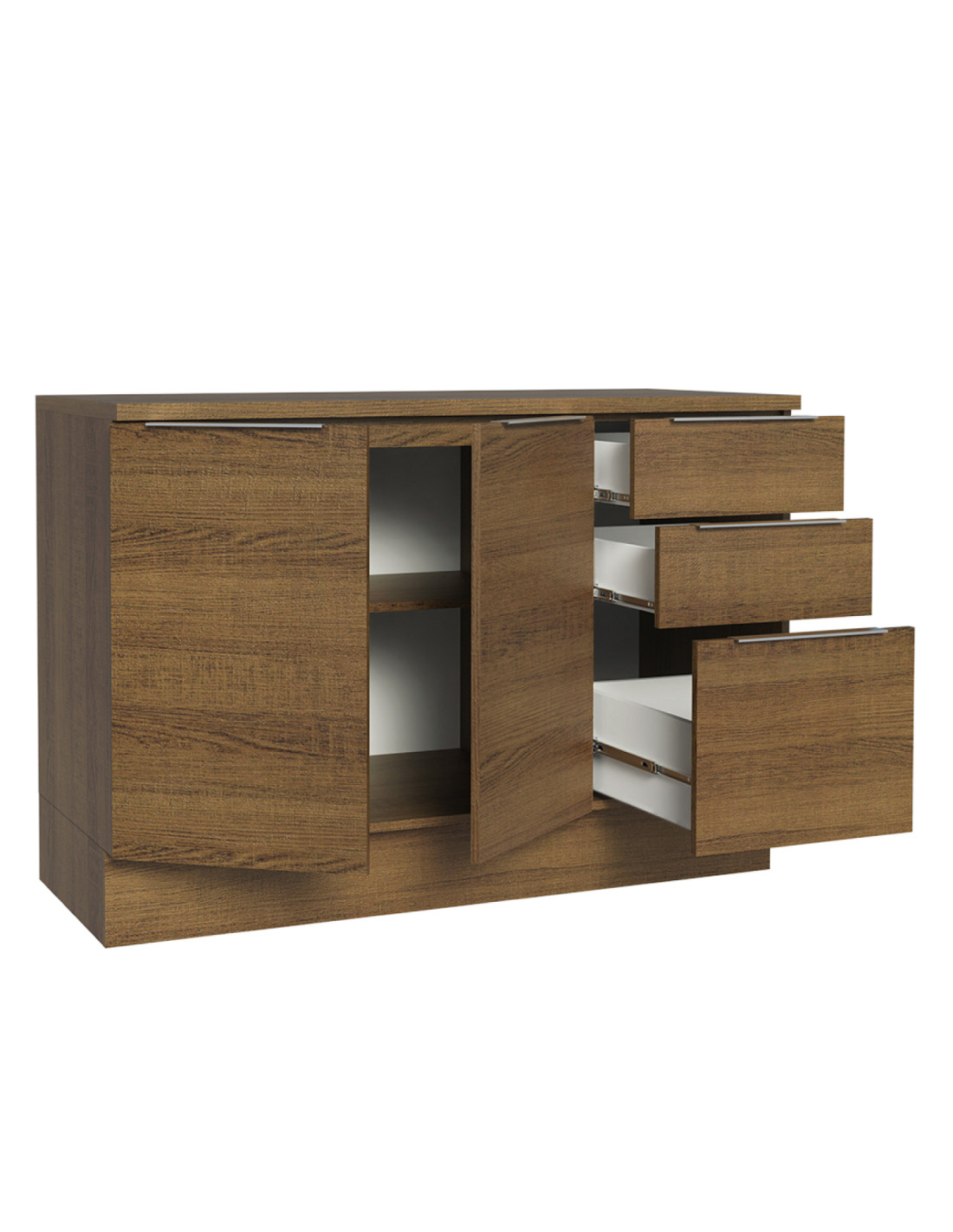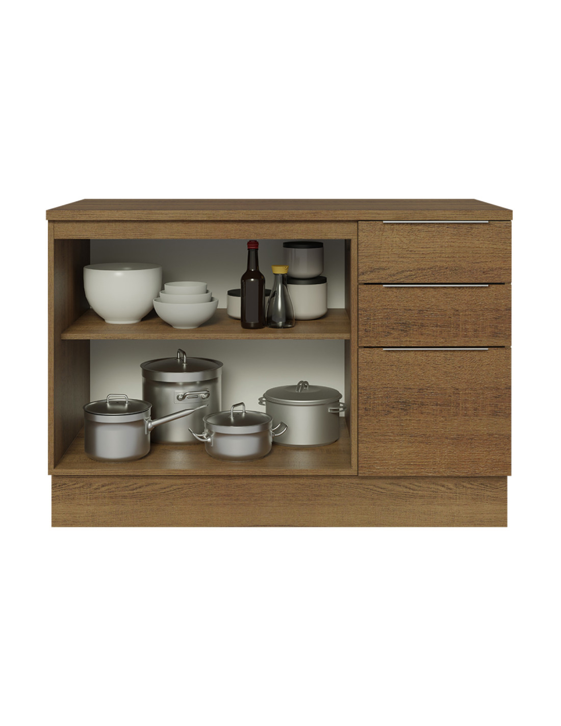 La base de cocina Stella café de 120 cm, con dos puertas y tres cajones, ha sido diseñada para maximizar el aprovechamiento de tu espacio y mantener todo perfectamente organizado. Con materiales de alta calidad, como tiradores de aluminio y bisagras metálicas con amortiguación, cada apertura es suave y precisa. El elegante acabado en madera rústica, combinado con la Pintura Poliéster de 7 capas, protege el mueble contra el alcohol, agua y calor. Sus patas regulables en PVC y rodapié desmontable hacen la limpieza más sencilla. Un mueble funcional que se adapta a tus necesidades, haciendo de tu cocina un espacio único y lleno de posibilidades.