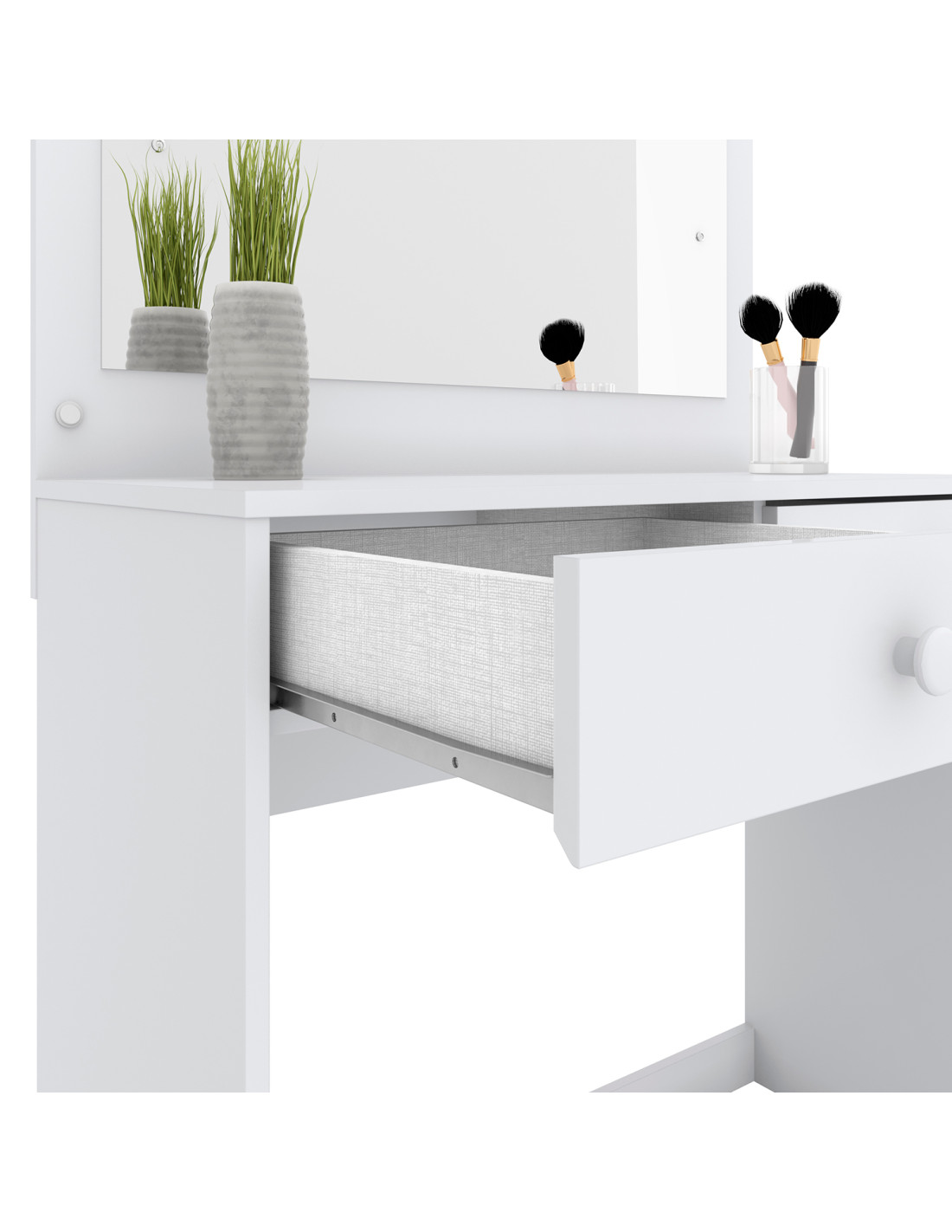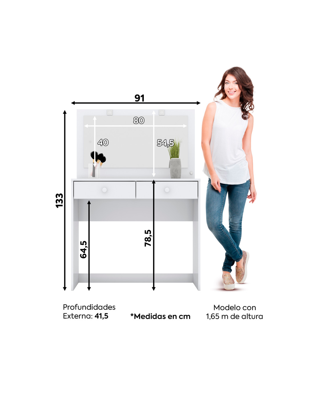El tocador Daila blanco combina simplicidad y elegancia en un diseño luminoso y funcional. Su acabado en blanco aporta frescura y amplitud visual, mientras sus compartimientos ofrecen orden con estilo. Ideal para dormitorios modernos, crea un espacio sereno y armónico. Cada detalle refleja la búsqueda de equilibrio entre estética y funcionalidad, transformando la rutina en un momento de calma y bienestar.