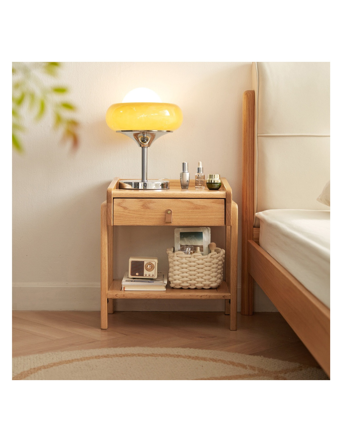 Velador Asier 1 cajón con diseño de inspiración natural y estructura resistente. Ideal para dormitorios modernos que buscan orden, calidez y estilo atemporal.