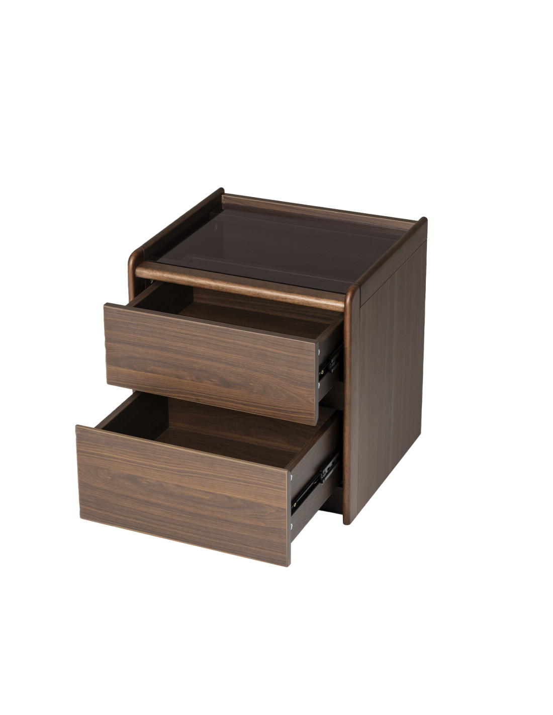 Velador de 2 cajones con cubierta de vidrio y estructura de madera, ideal para organizar tu dormitorio con estilo y funcionalidad.