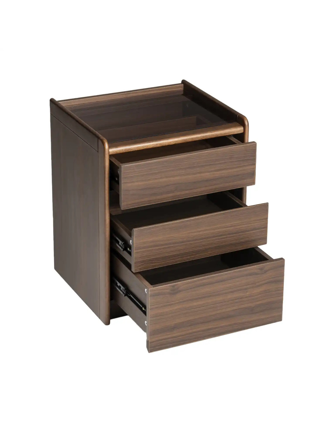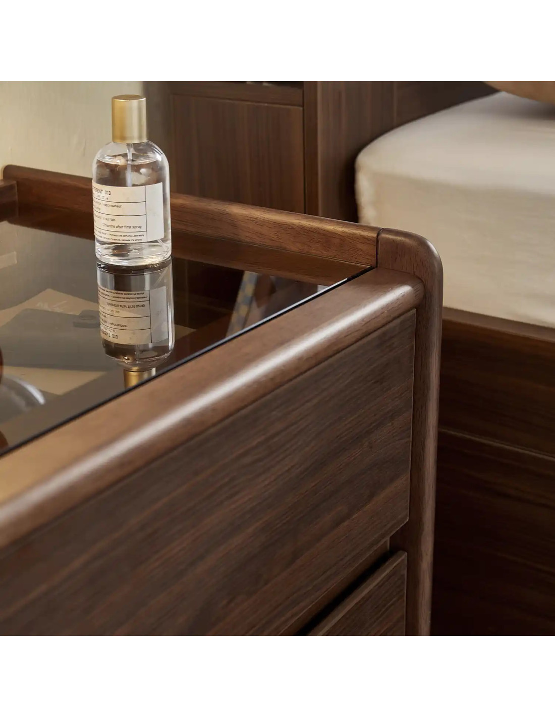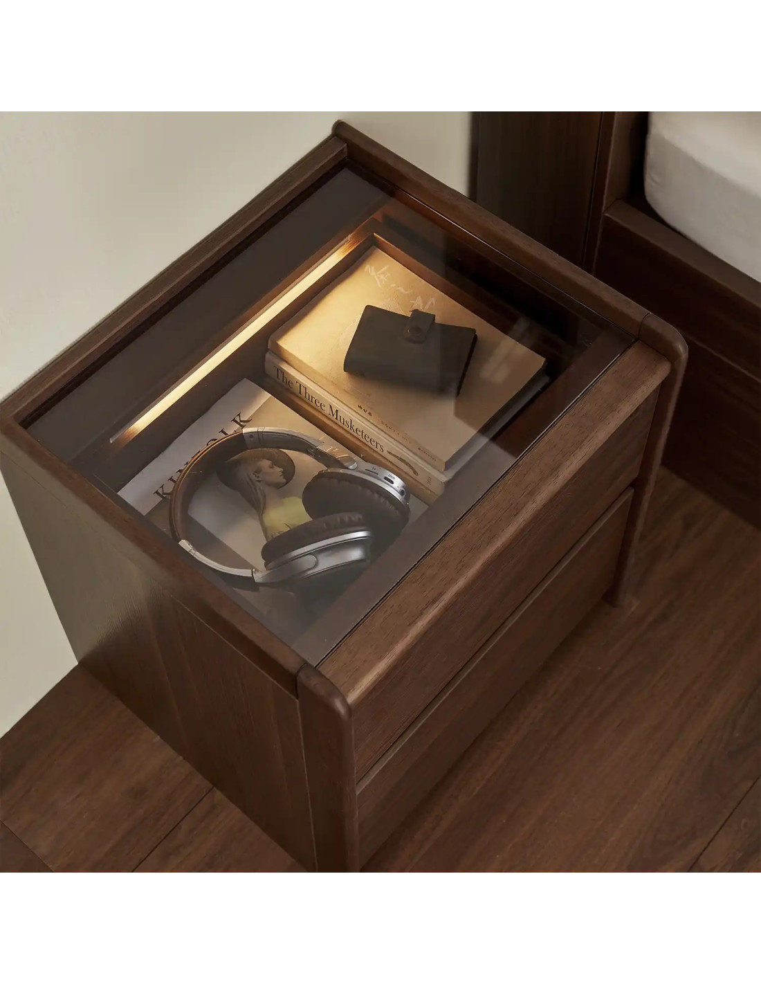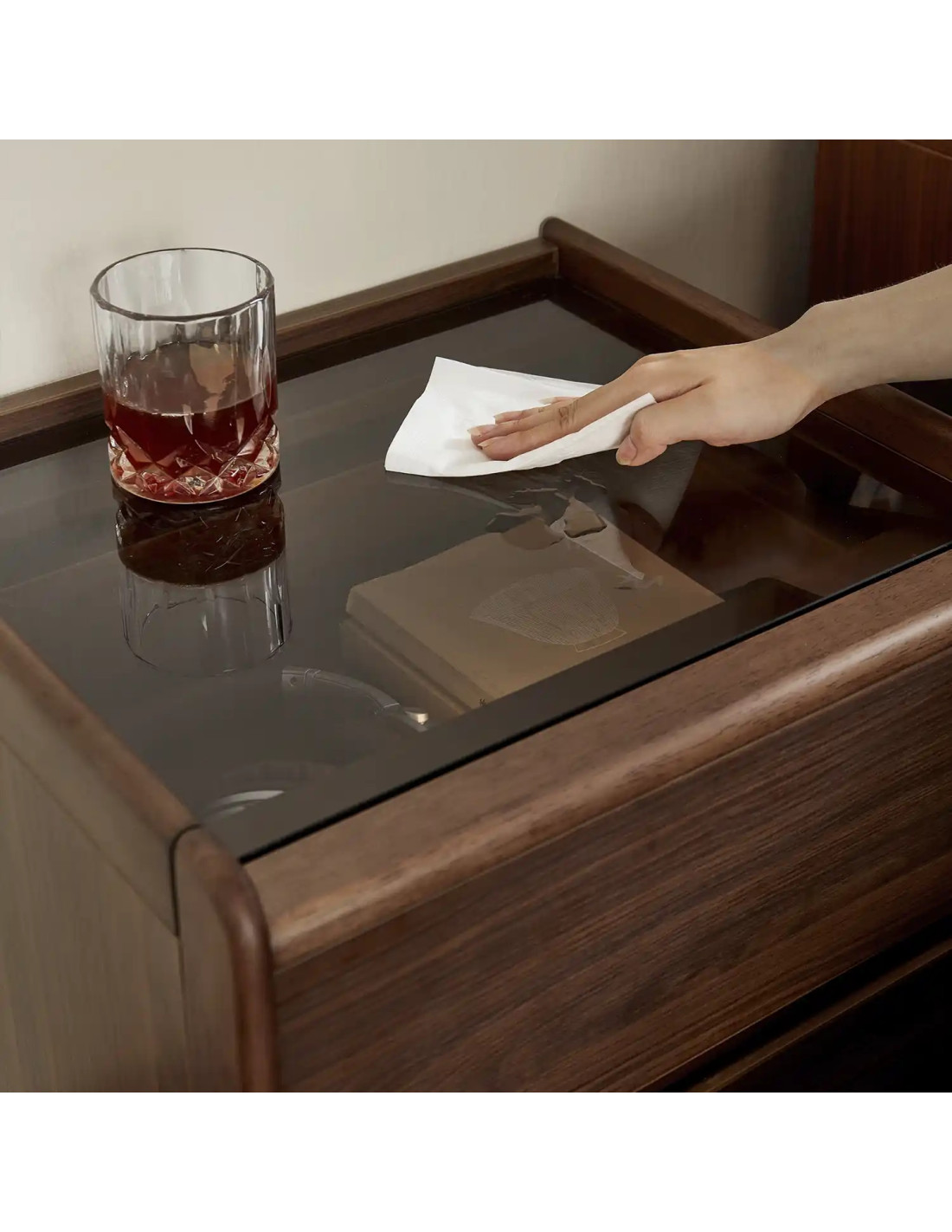 Velador de 2 cajones con cubierta de vidrio y estructura de madera, ideal para organizar tu dormitorio con estilo y funcionalidad.