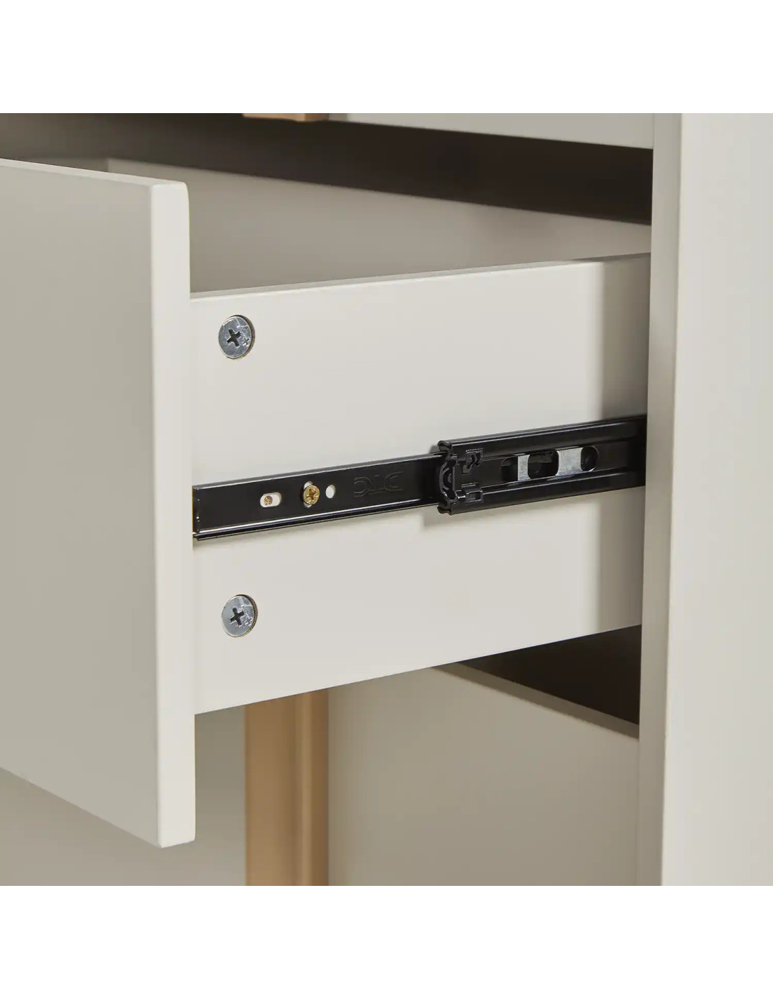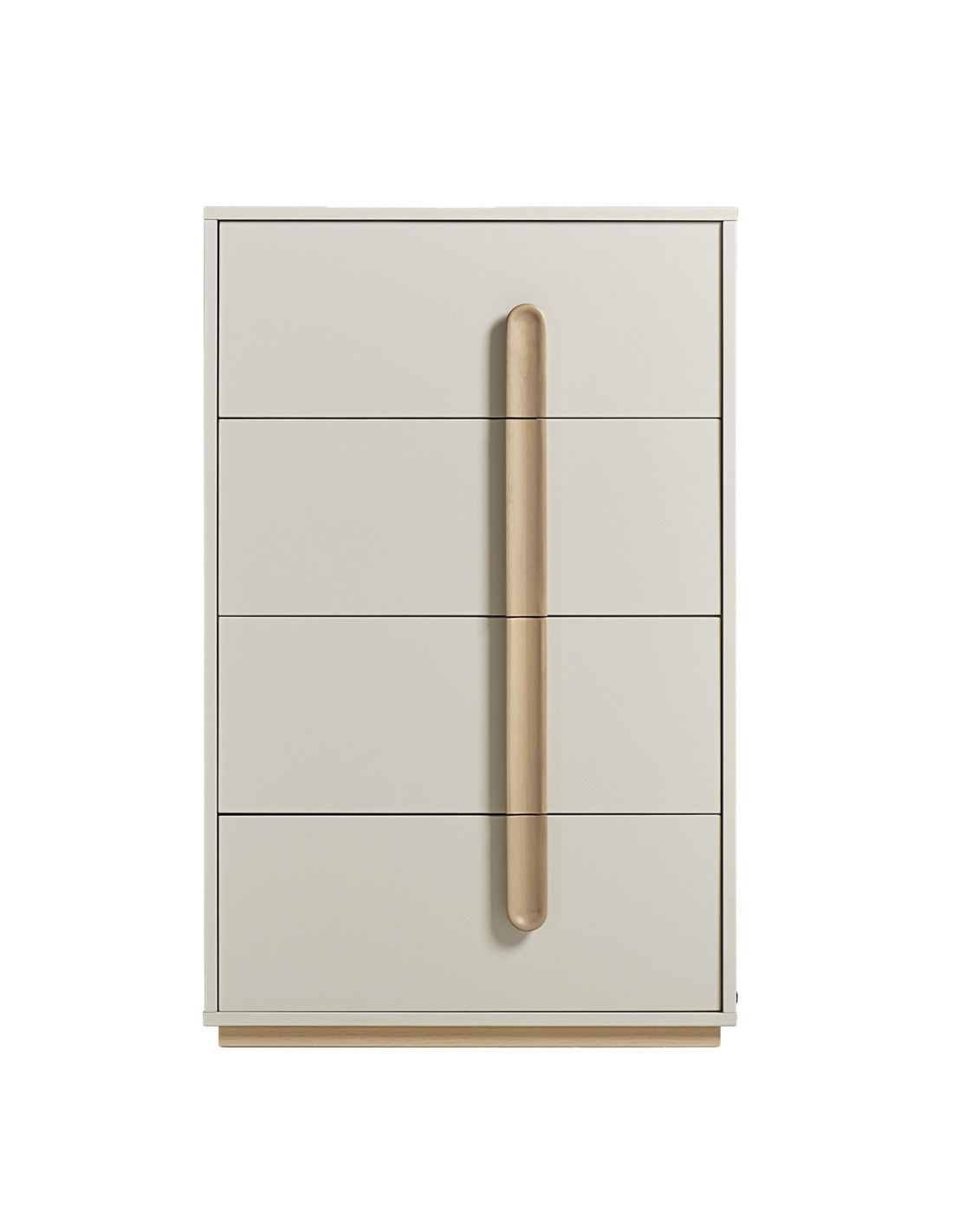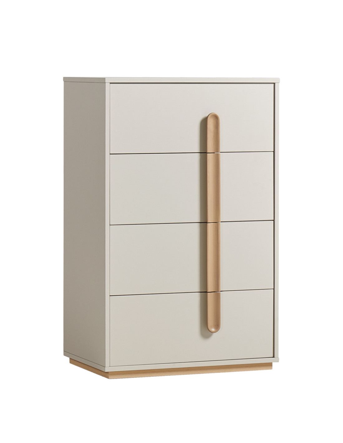 Fabricado en MDF melamina, cuenta con 4 cajones que entregan un espacio práctico para guardar objetos de uso diario. Además, incorpora rieles telescópicos de acero laminado en frío, que permiten una apertura y cierre más suaves, y tiradores de madera de abedul, que suman un detalle natural y distintivo a su diseño.