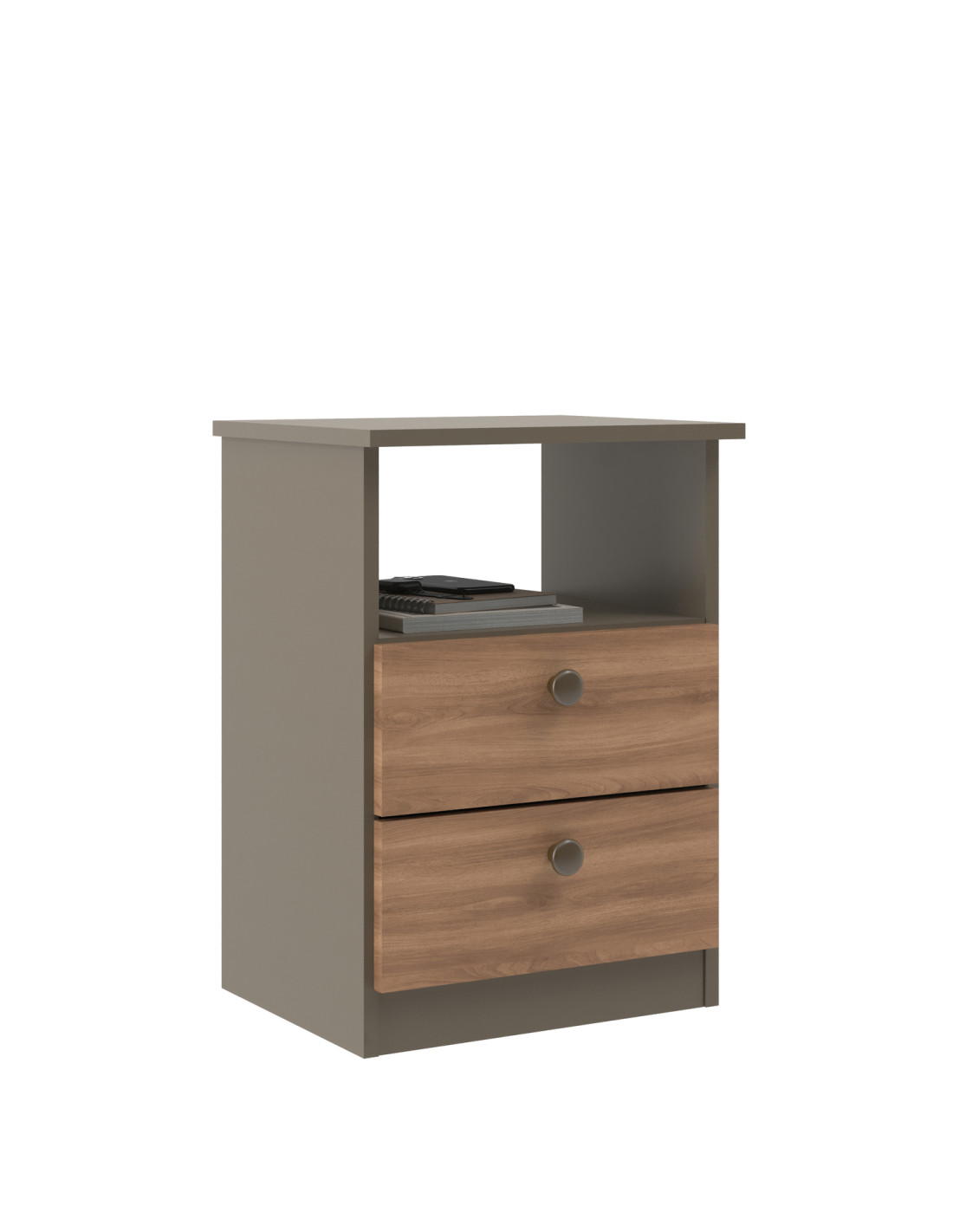 Velador moderno de 2 cajones con acabado nogal y diseño cálido y funcional.