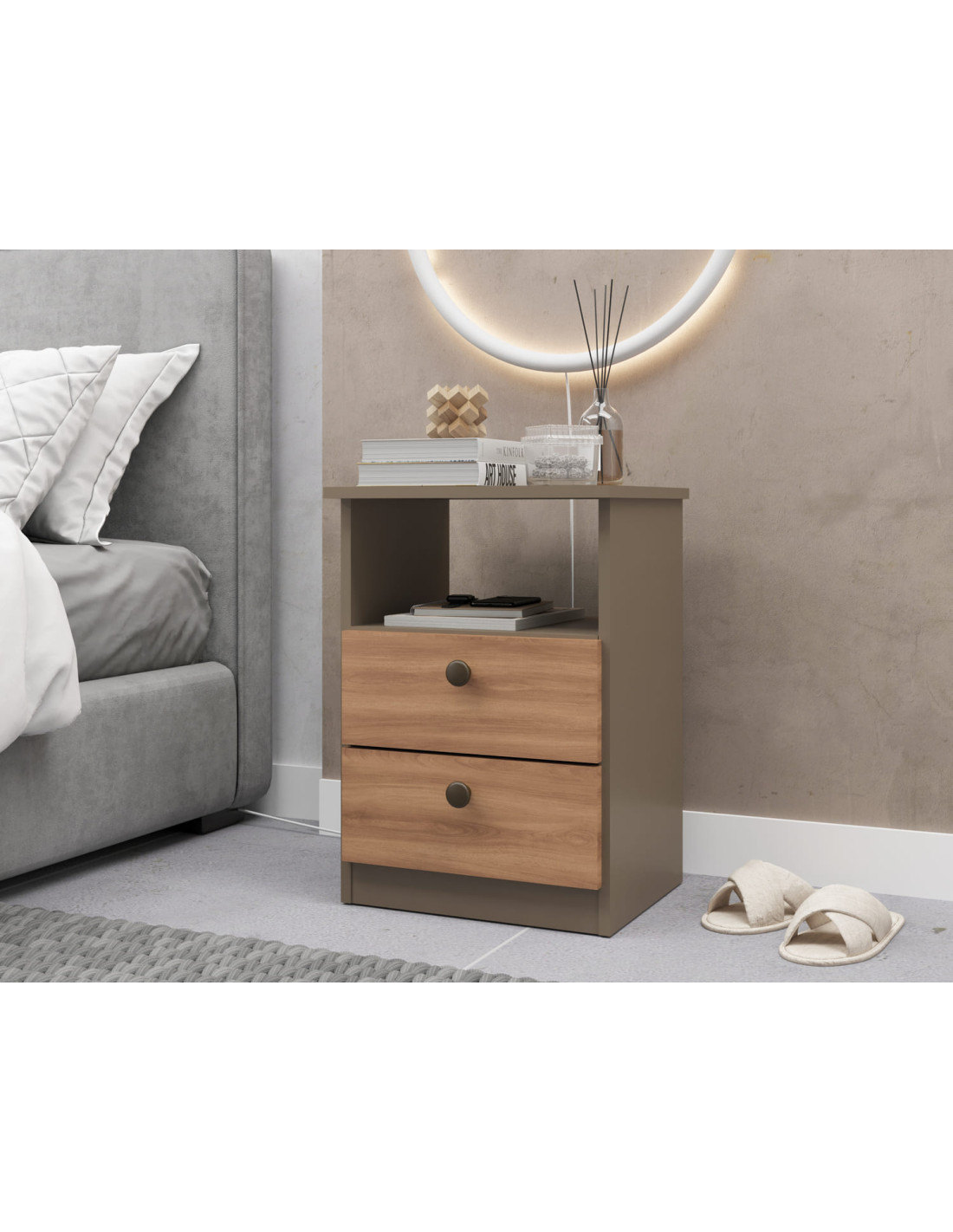 El velador 2 cajones Damasco/Nogal refleja un diseño contemporáneo con alma natural. Sus tonos cálidos y textura de madera realzan la elegancia del espacio, mientras los cajones amplios brindan funcionalidad. Ideal para dormitorios modernos, combina practicidad con un estilo sofisticado y acogedor. Una pieza que transmite orden, equilibrio y confort visual con un toque de distinción.