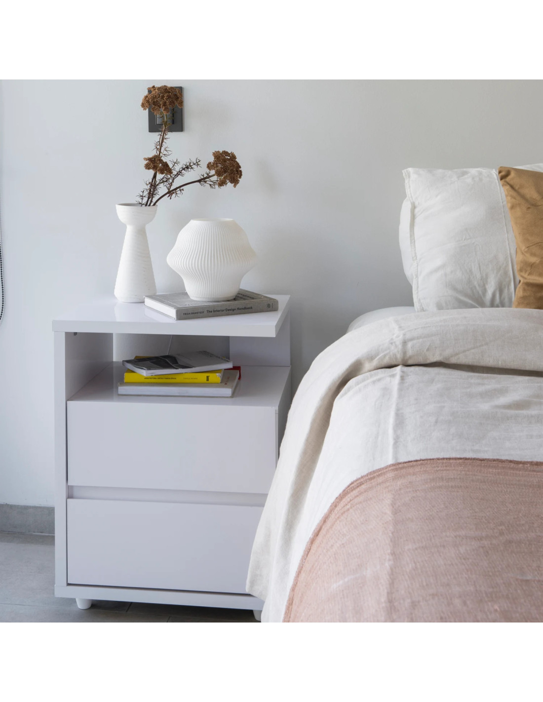 Velador en MDF melamina blanca con opción de armado para lado izquierdo o derecho, ideal para complementar tu dormitorio con estilo y funcionalidad.