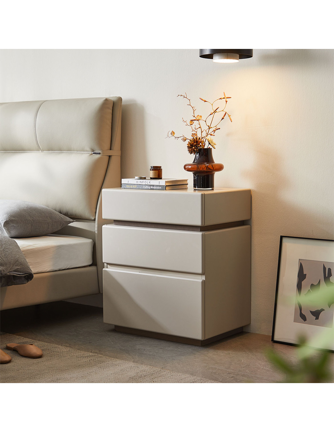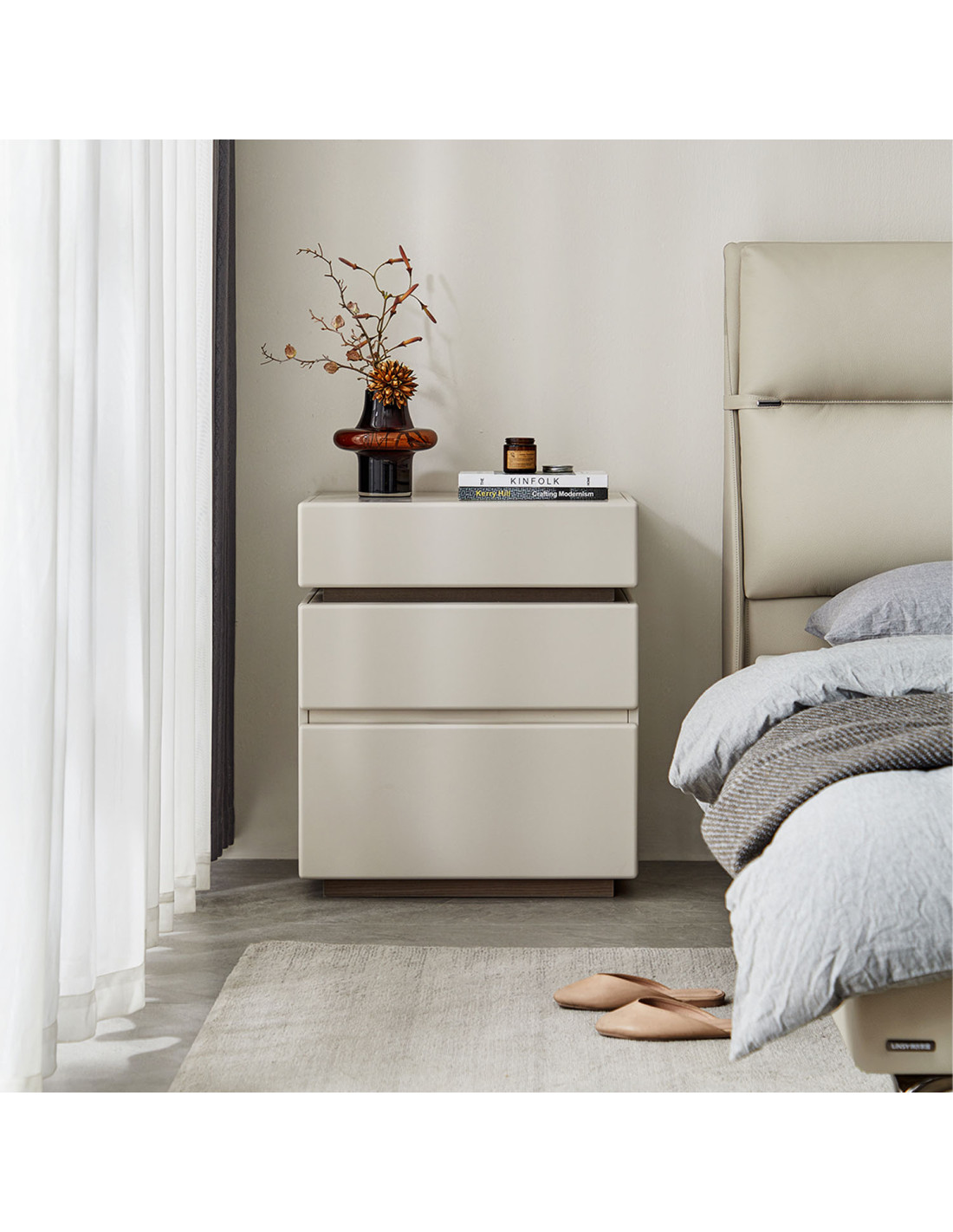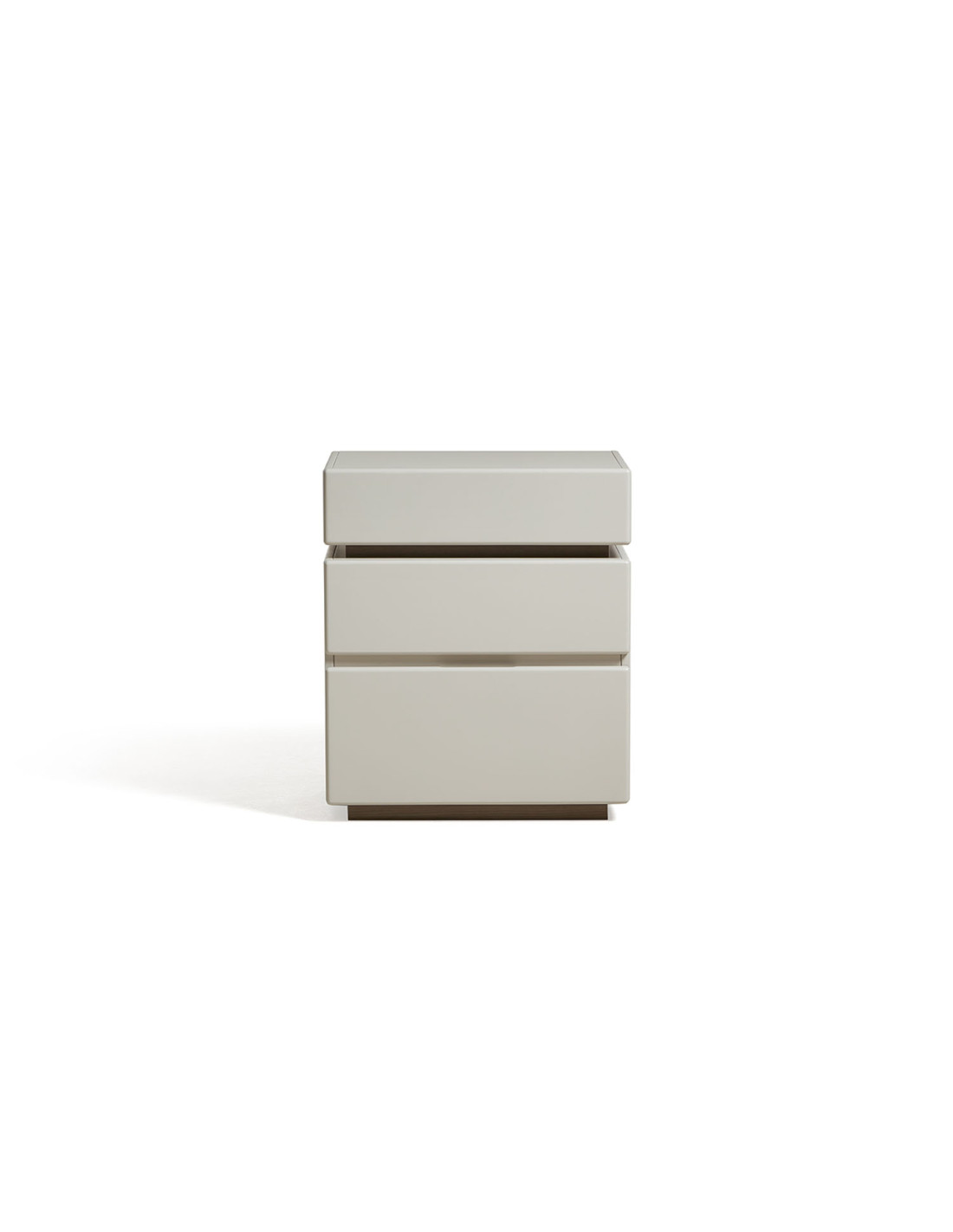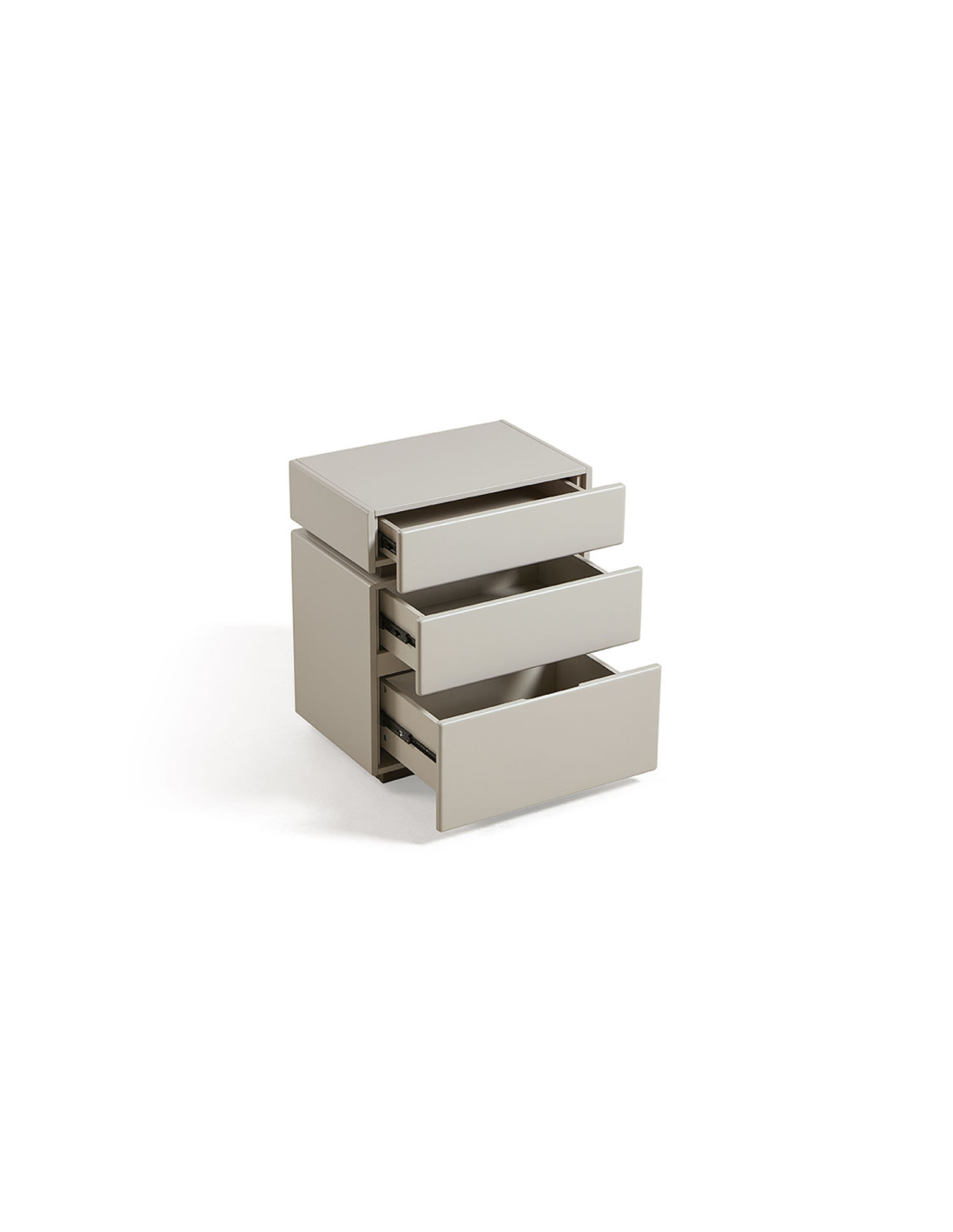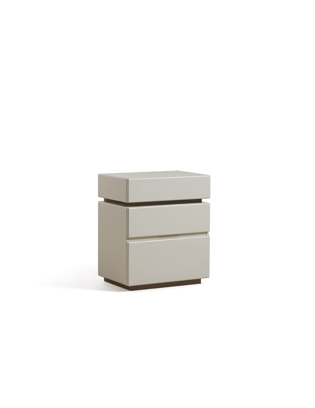 Velador Kanso gris claro con 3 cajones — mueble funcional y moderno para dormitorio. Diseño elegante que aporta espacio de almacenamiento práctico y estilo contemporáneo.